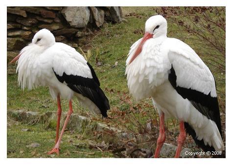 Die Weisstörche gelten als die größeren Vertreter mit einer Körperhöhe bis zu 1 m. Sie erreichen eine Flügelspannweite von ca. 2 - 2,20 m und wiegen 2,5 - 4,5 kg. Das Federkleid ist - wie der Name schon sagt - bis auf die schwarzen Schwungfedern an den Flügeln - weiß. Die langen Beine und der nach vorn spitzverlaufende Schnabel sind während der Balz rot und danach schwach rötlich.
