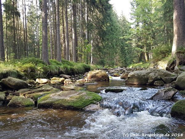 Entlang von Flüssen und Seen in Tschechien, Foto (l): Schwarzwasser im Erzgebirge 2008; Bild (r): Stausee Myslivny im Erzgebirge 2008
