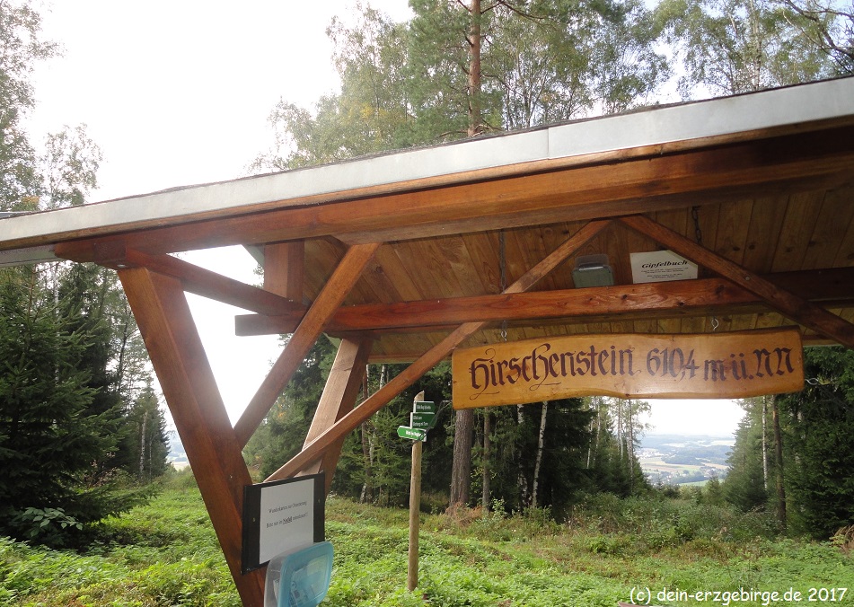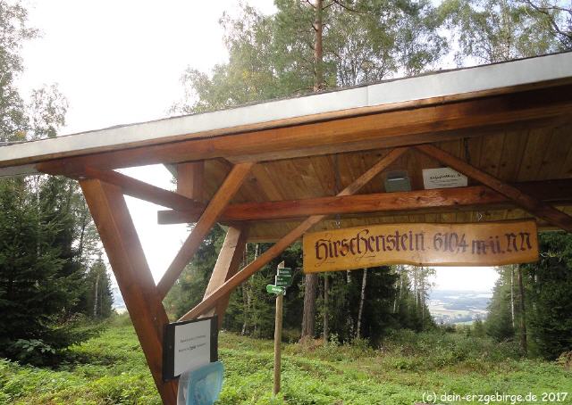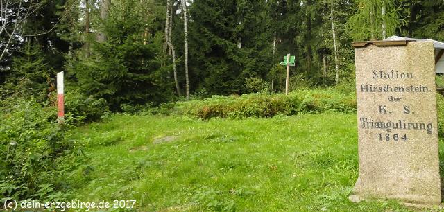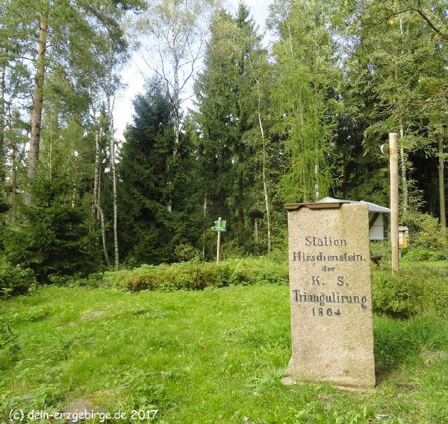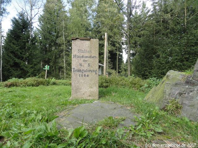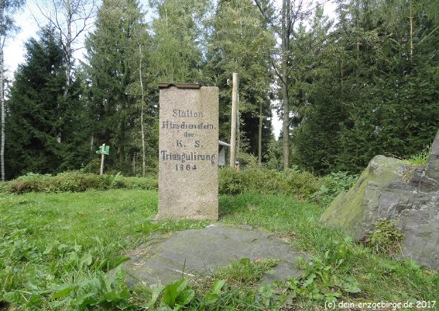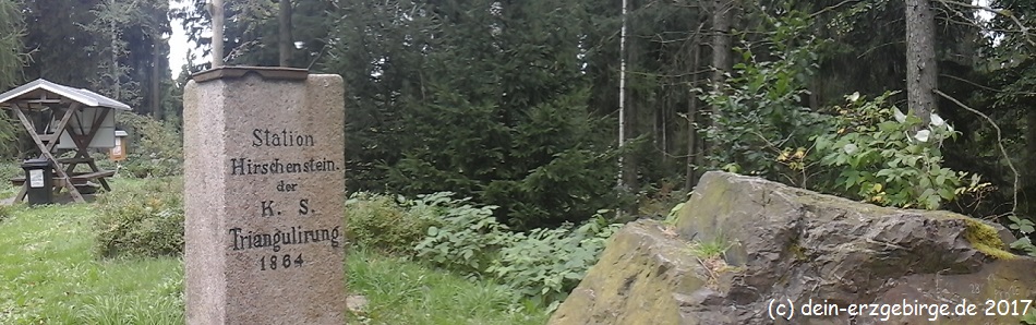 Der Berg Hirschenstein, auf welchem sich früher auch ein Turm befand ..., hat eine Höhe von ca. 610,4 m ü. NN. Er ist damit die höchste Erhebung im Landkreis Zwickau. Auf dem Hirschenstein im Erzgebirge steht eine Säule mit der Inschrift "Station Hirschenstein der Königlich Sächsischen Triangulirung 1864" (historischer Vermessungspunkt in Sachsen).