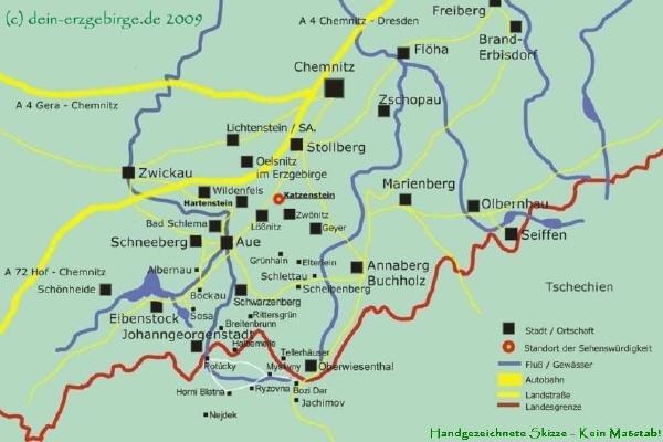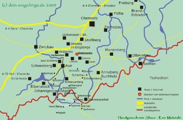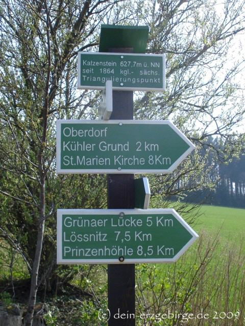 Den Aussichtspunkt vom Katzenstein (Affalter) erreicht man z.B. über "Wanderwege" aus Richtung Lößnitz, Affalter, Thalheim ... Entlang der Wanderwege zum Katzenstein kann man die idyllische Natur & Landschaft im Erzgebirge genießen. Der anfänglich unscheinbare Berg belohnt bei klarer Sicht mit einem herrlichen Weitblick über das Erzgebirgsvorland sowie auf die höheren Berge vom Erzgebirge - wie z.B. Fichtelberg, Klinovec, Auersberg u.s.w.