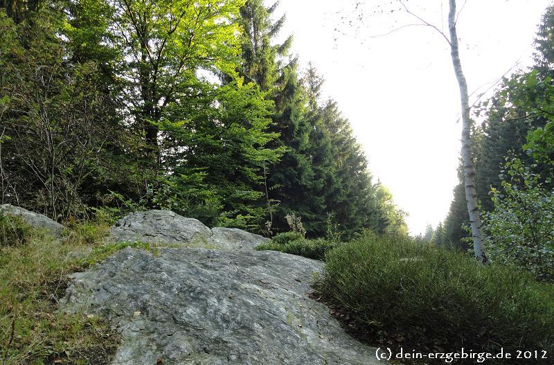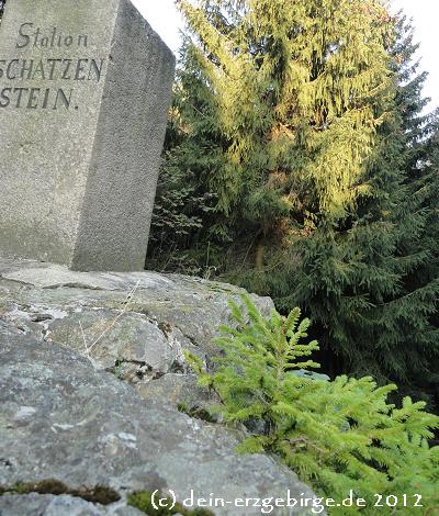 Die Höhenlage vom Schatzenstein in Sachsen bildet eine Wasserscheide an welcher die Zwönitzquelle entspringt - auch gibt es hier Phyllitklippen mit einer Höhe von bis zu 10 Metern. Im Gebiet vom Schatzenstein u.a. bei Elterlein führen Wanderwege durch die dichten Wälder vom Erzgebirge, so z.B. aus Richtung Hermannsdorfer Wiesen, Elterlein, Grünhain-Beierfeld, Bernsbach, Zwönitz ... Entlang der Wanderwege zum Schatzenstein kann man die idyllische Natur und Landschaft vom Erzgebirge genießen und dabei manch Sehenswertes entdecken.