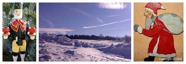 Fotos (l, r): kleine Sehenswürdigkeiten im Erzgebirge, geschnitzter Berg- & Weihnachtsmann; Bild (m): an den Wanderwegen im Erzgebirge (2008)