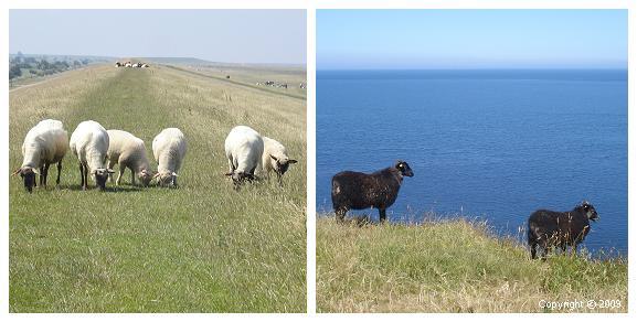 Entlang der Nordsee-Deiche führen kilometerlange Wanderwege z.B. von Cuxhaven über Dorum-Neufeld nach Bremerhaven. Hin und wieder kreuzen ein paar Schafe den Weg der Wanderer.