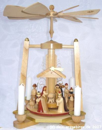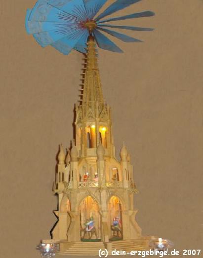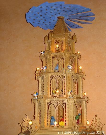 Vorbild bei der Entstehung der Weihnachts-Pyramide im Erzgebirge soll einerseits das Göpel (ein durch Pferde oder Wasser betriebener Bergbau-Schacht) gewesen sein ... Aber auch die Ansicht daß die Seiffener Barrockkirche als Grundriß für die erzgebirgische Pyramide diente, besteht. Gewiss ist, daß Weihnachtspyramiden im Erzgebirge in einer Strophe vom alt-erzgebirgischen Heiligabendlied besungen wurden. |