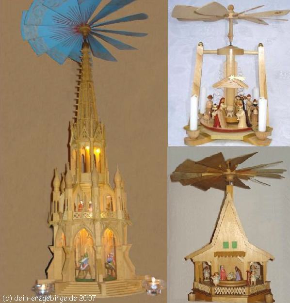 Die erzgebirgische Volkskunst wurde im Laufe der Zeit stetig weiterentwickelt und so wuchs auch die Vielfalt und Formenpracht der Pyramiden im Erzgebirge. Die heutige Weihnachtspyramiden-Vielfalt reicht von der Stabpyramide über die Tischpyramide, Wandpyramide ... bis hin zur großen mehrstöckigen Säulenpyramide ... sowie den bis zu mehreren Metern hohen Orts-Weihnachtspyramiden im Erzgebirge. Diese s.g. Orts-Pyramiden schmücken viele Städte, Orte & Gemeinden im Erzgebirge und sind wunderbar anzusehen. |