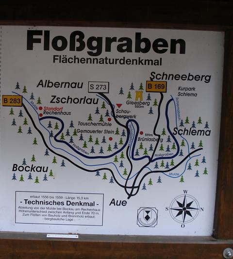 Der Floßgraben beginnt in Albernau am "Rechenhaus" (nahe Bockau) und wird vom Wasser des Flusses Zwickauer Mulde gespeist. Er führt in seinem Verlauf durch die malerische Landschaft vom Erzgebirge mit Wäldern, Wiesen, Felsen ... und mündet am Ende in den Schlemabach im Kurpark von Bad Schlema (Sachsen). Der Floßgraben gilt heute als Denkmal und zählt zu den besonderen Sehenswürdigkeiten im Erzgebirge. Parallel zum Floßgraben führt ein Wanderweg durchs Erzgebirge und seine reizvolle Natur ... auch ergeben sich romantische Rastmöglichkeiten mit teils herrlichem Ausblick auf die Berge vom Erzgebirge u.v.m.