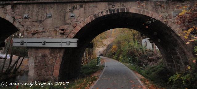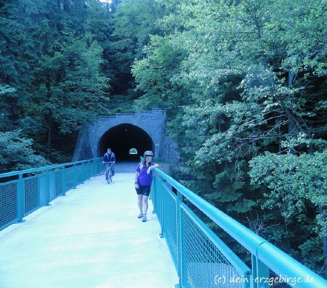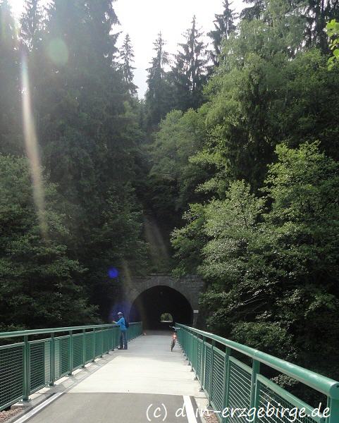 | Bild: "In Sachsen, zwischen Bockau und Aue entlang der Karlsroute - einem schönen Radwanderweg durchs Erzgebirge ..." | Foto: "Entlang dem Radweg Karlsroute / hier: bei Bockau im Erzgebirge, auf einer Brücke über die Zwickauer Mulde und an einem ehem. Eisenbahntunnel ..." |